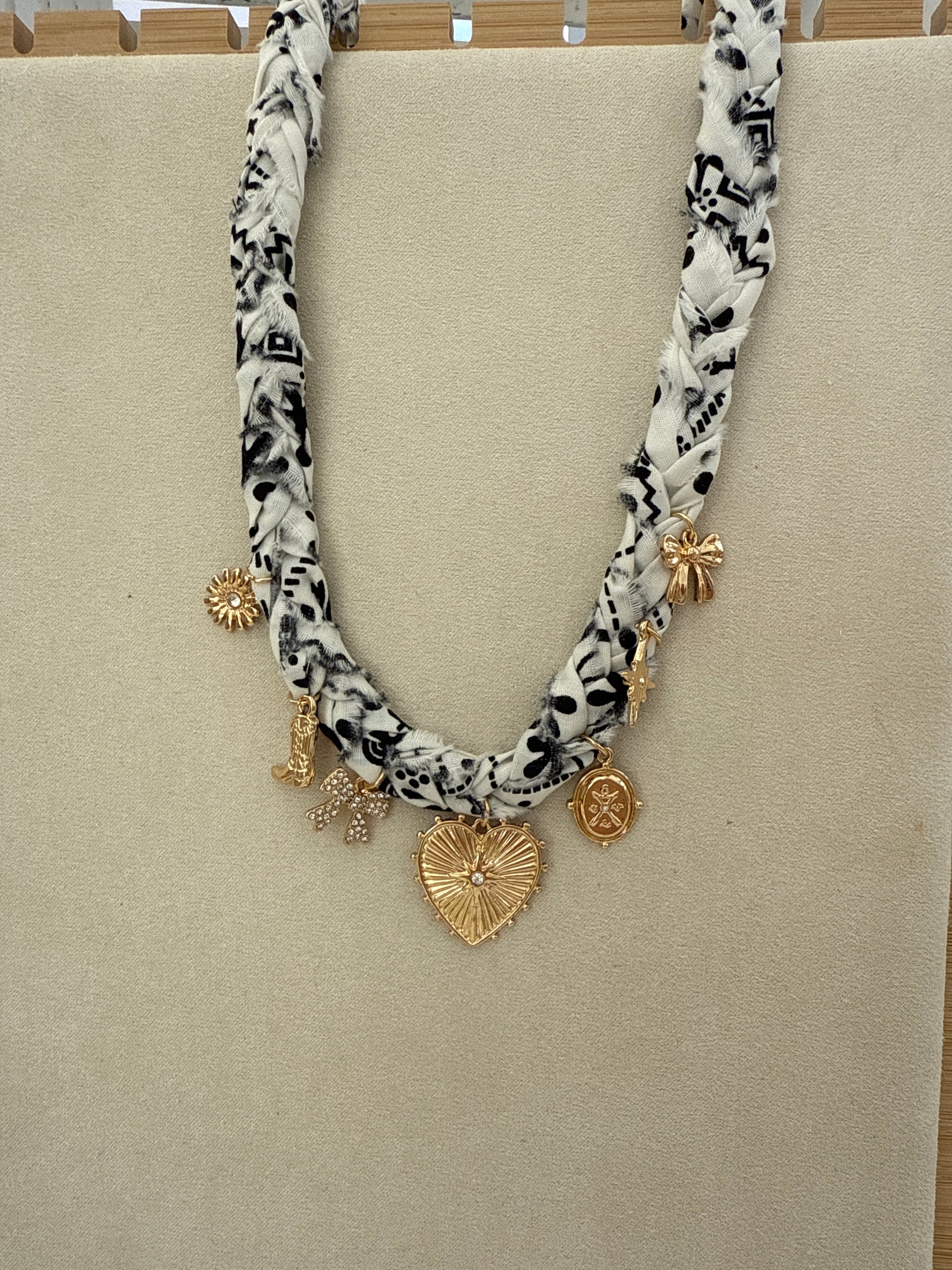 White & Black Braided Scarf Necklace With ♡, boot & bow