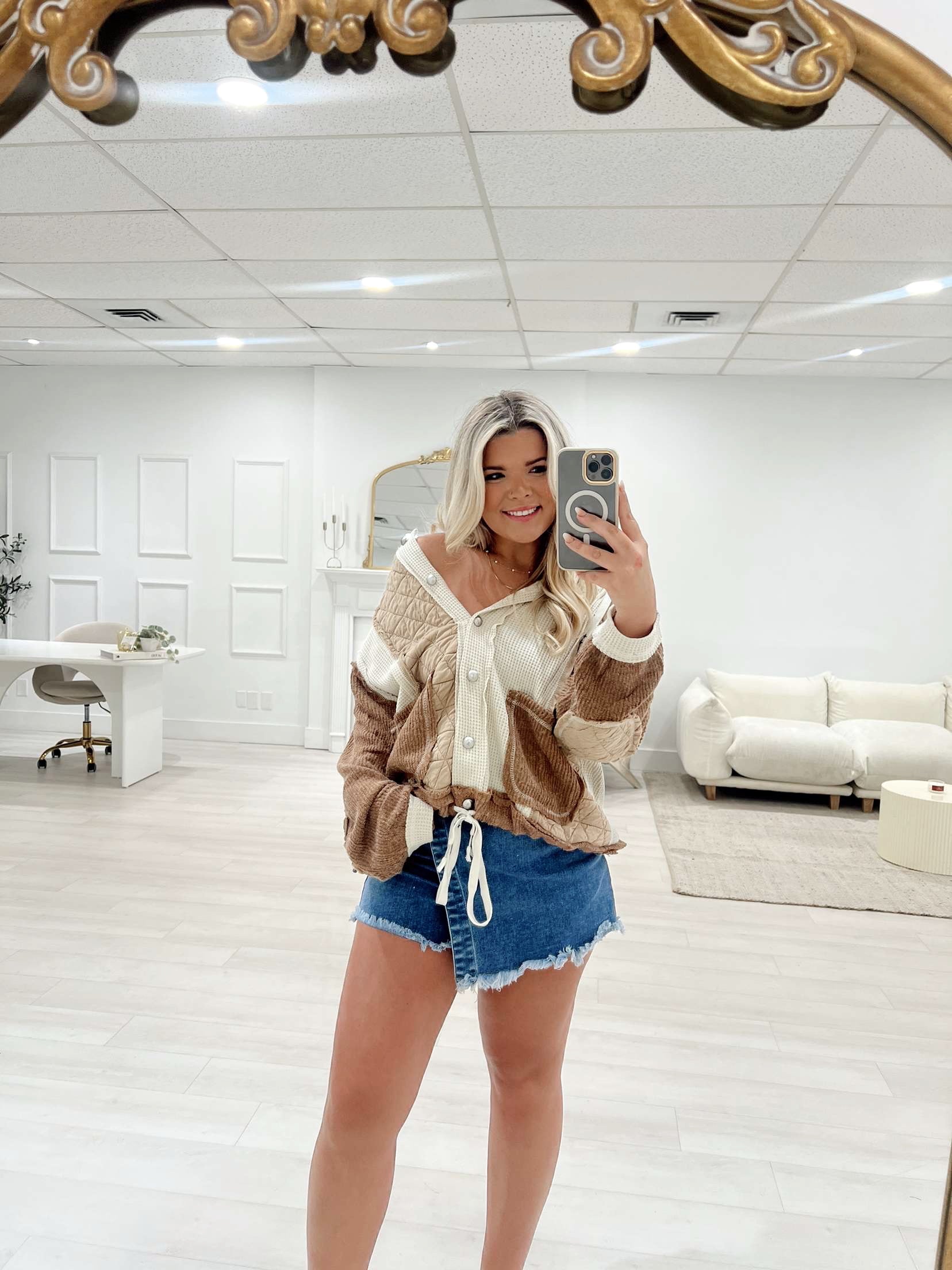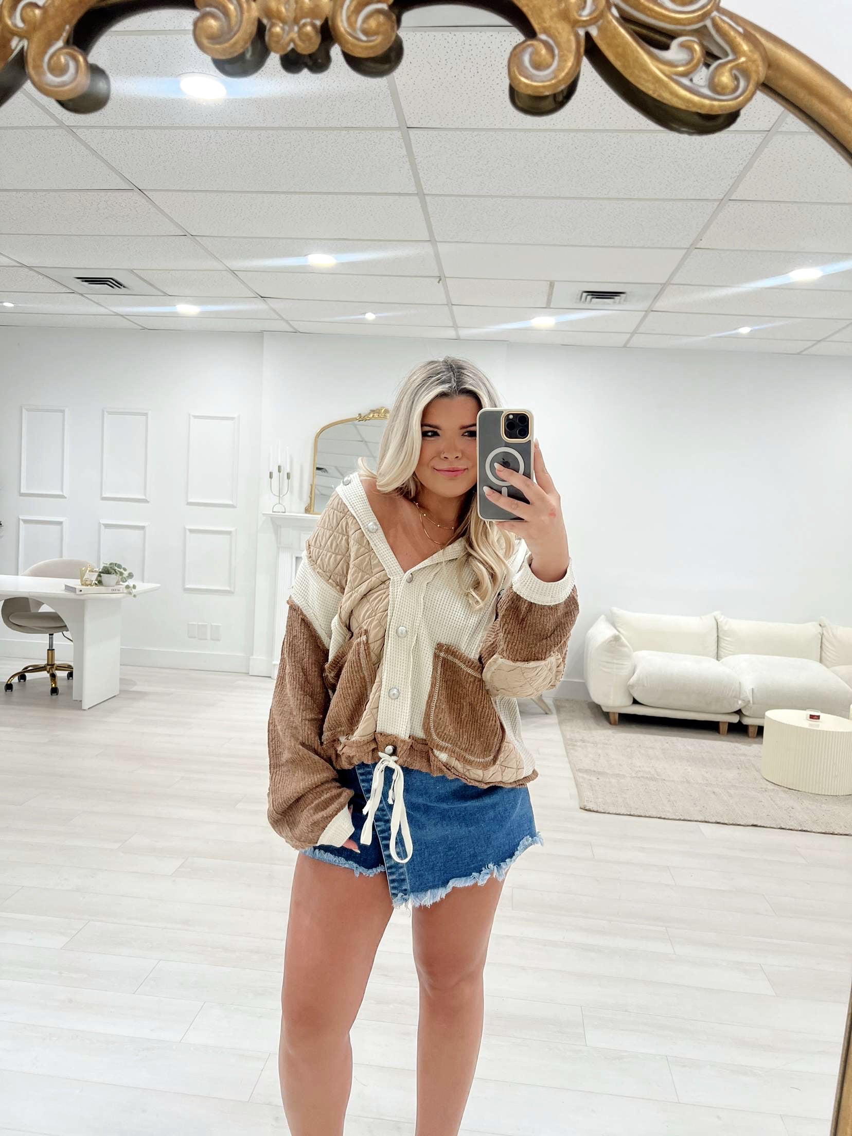 Designed in button down oversized fit jacket with hoodie featured in thermal, quilted knit and cut and sew sweater knit.