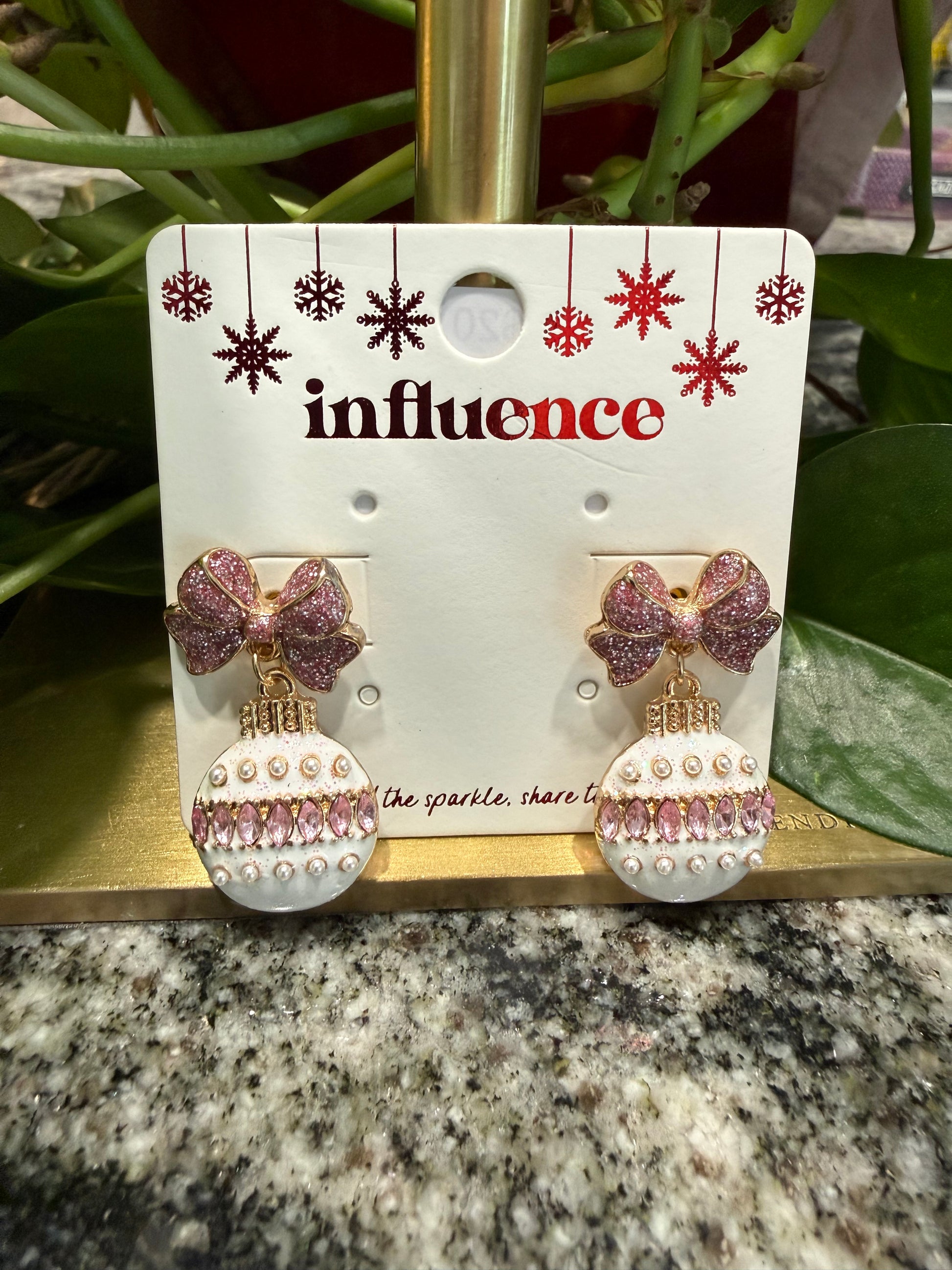 Christmas Pink & White Rhinestone Bow and Ornament Earring
