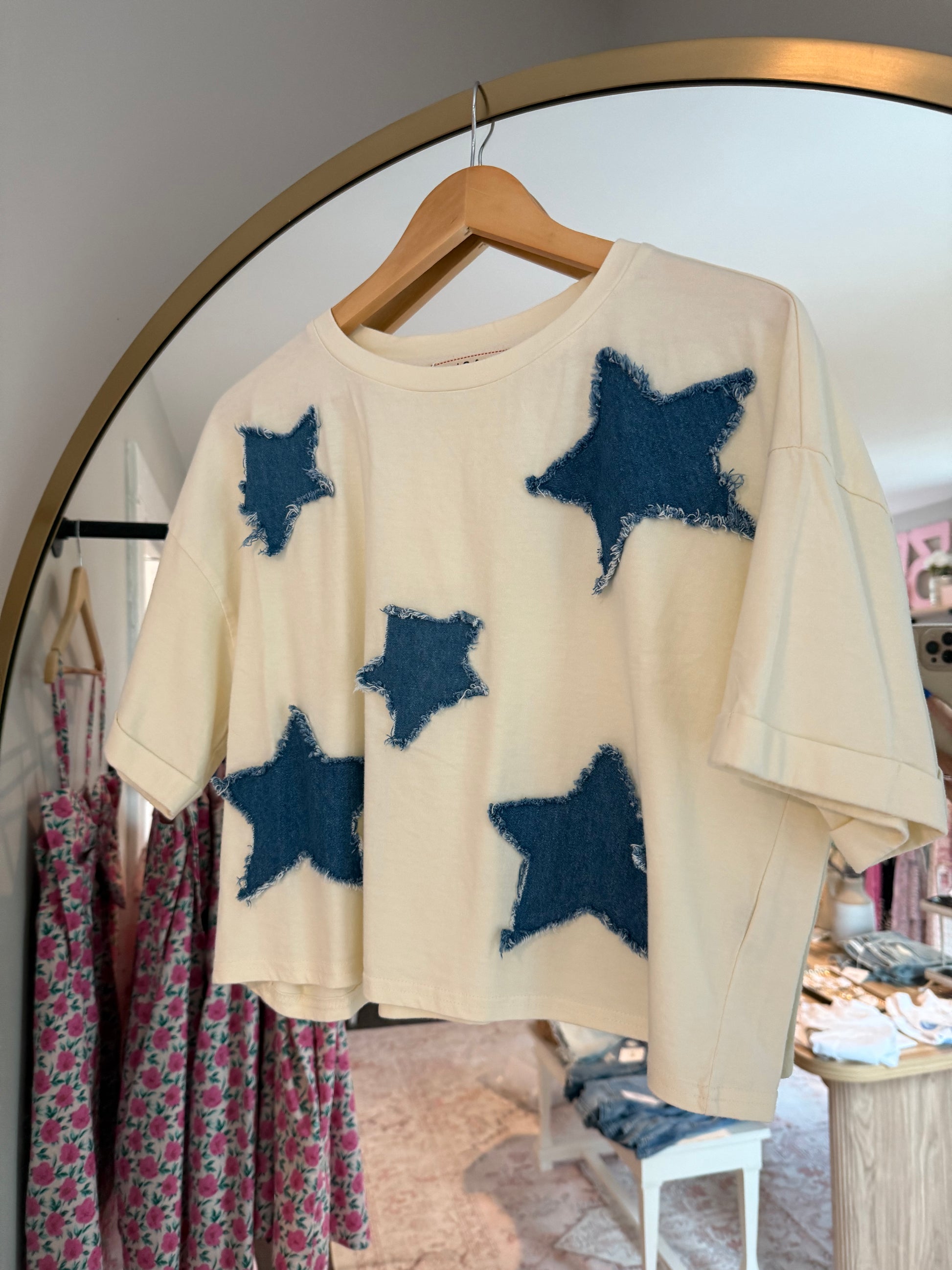 ROUND NECKLINE SHORT SLEEVES RELAXED FIT SHEER CROCHET KNIT PULLOVER SWEATER AMERICAN FLAG CROCHET DETAIL NOT LINED 100% COTTON