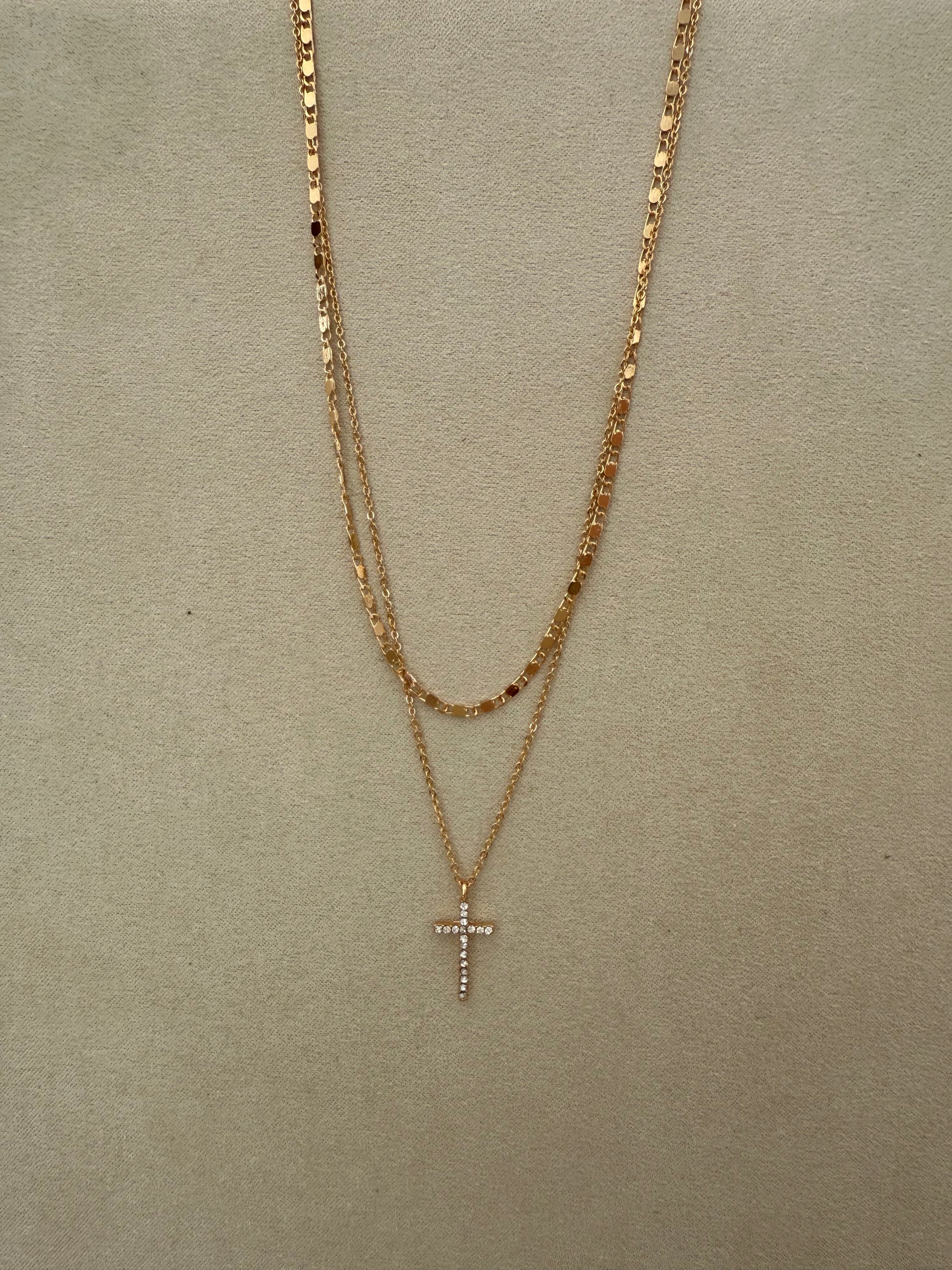 Gold Layered Chain with Rhinestone Cross 16"-18" Necklace