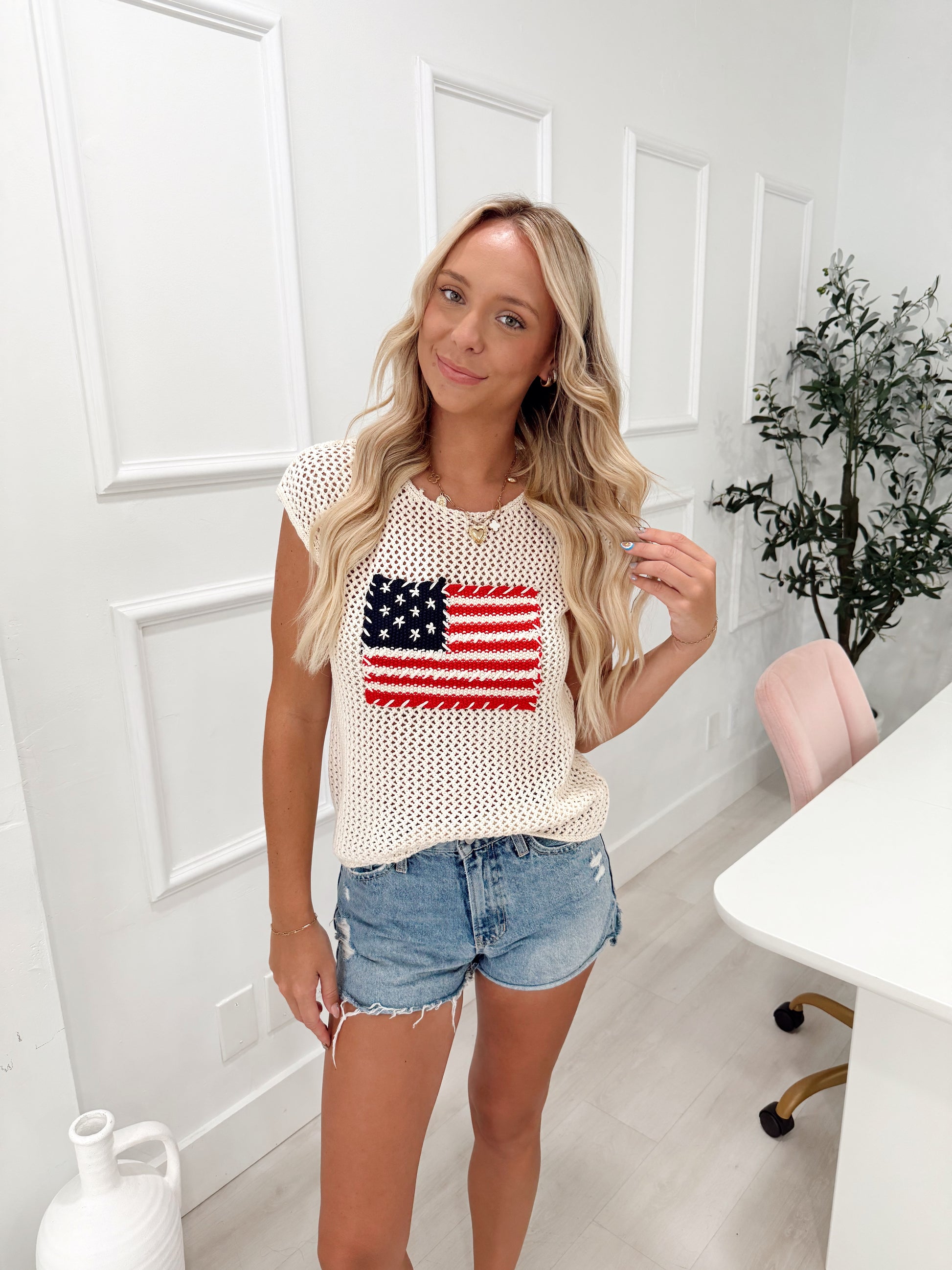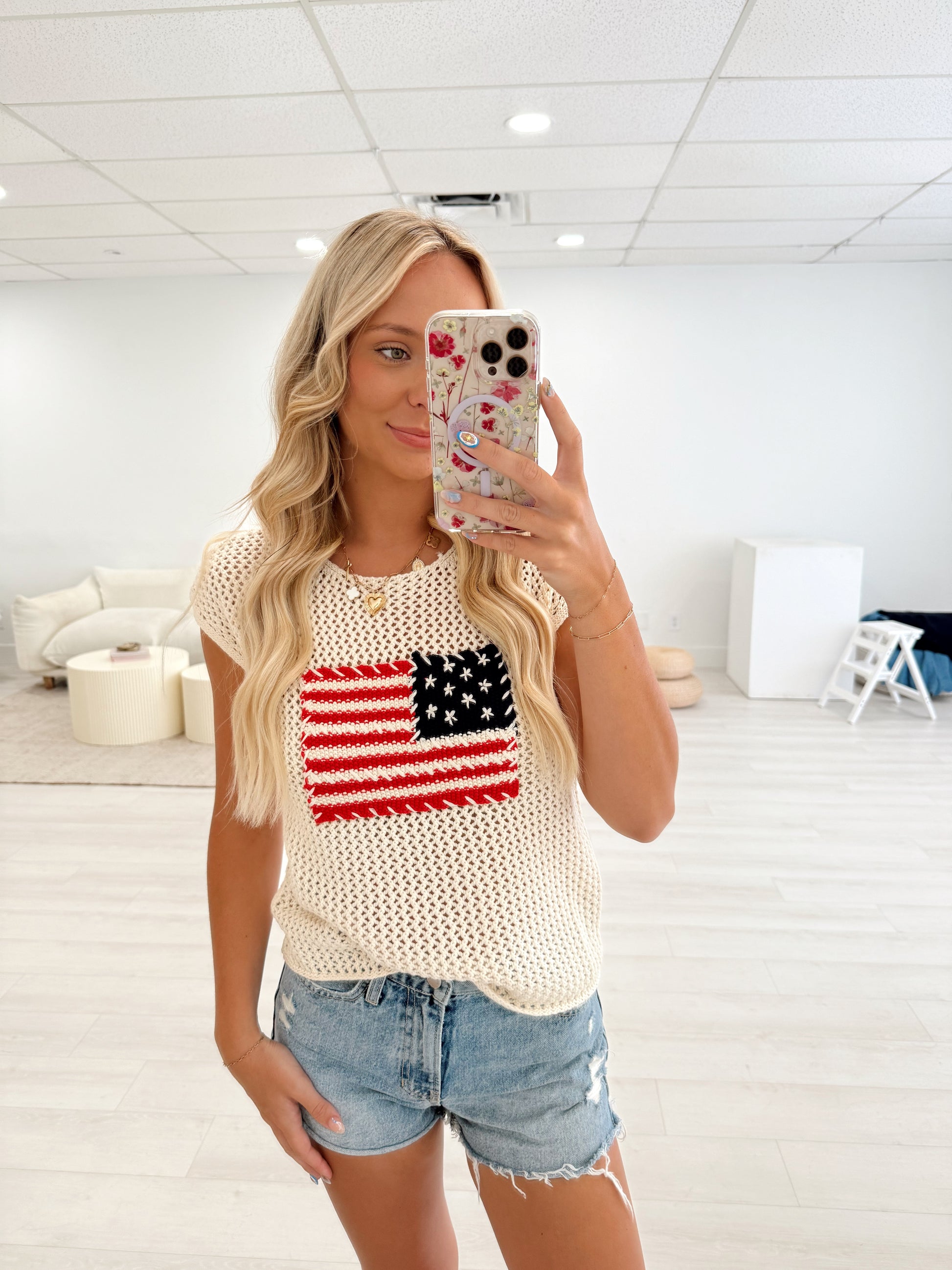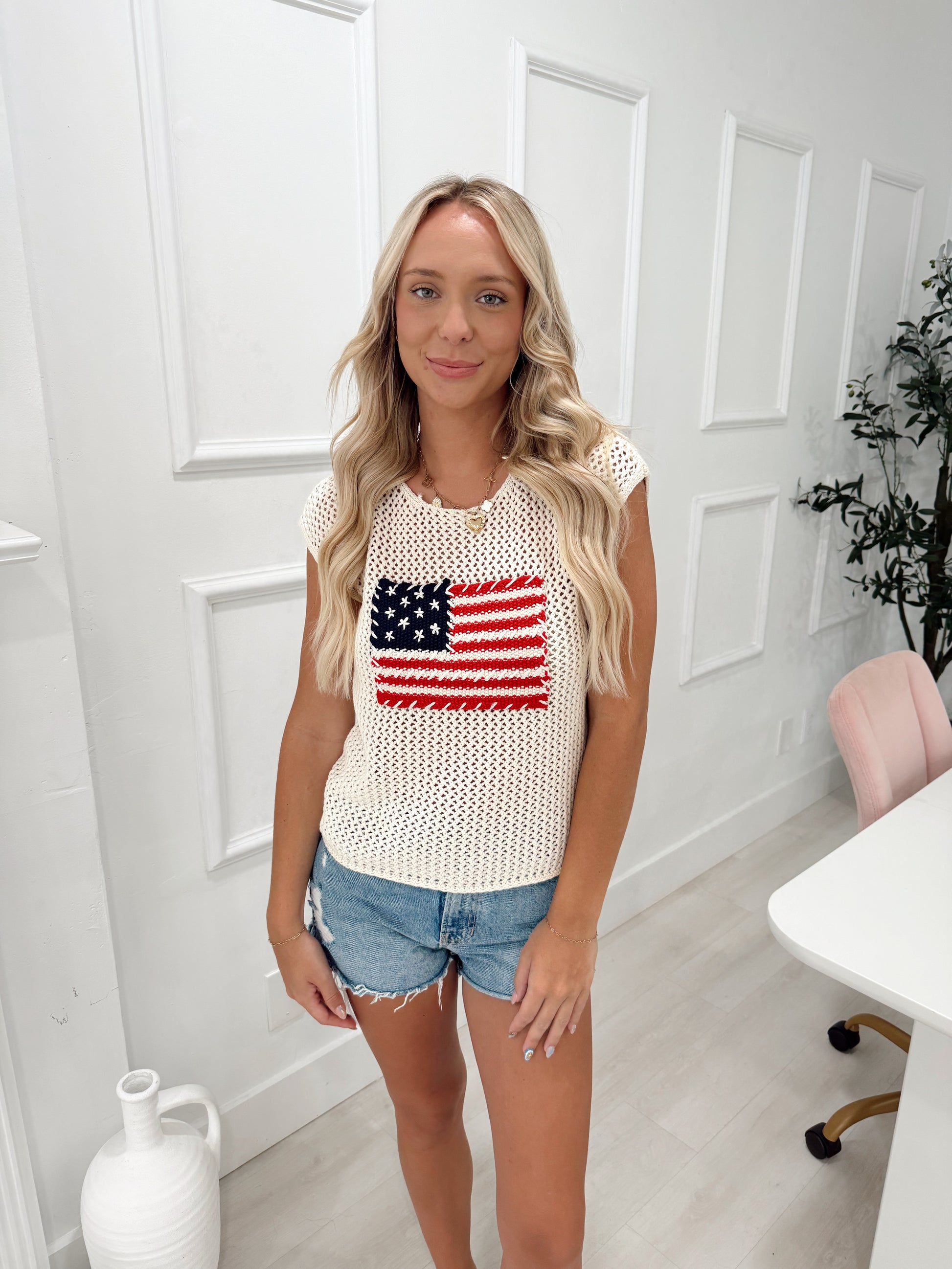 ROUND NECKLINE SHORT SLEEVES RELAXED FIT SHEER CROCHET KNIT PULLOVER SWEATER AMERICAN FLAG CROCHET DETAIL NOT LINED 100% COTTON
