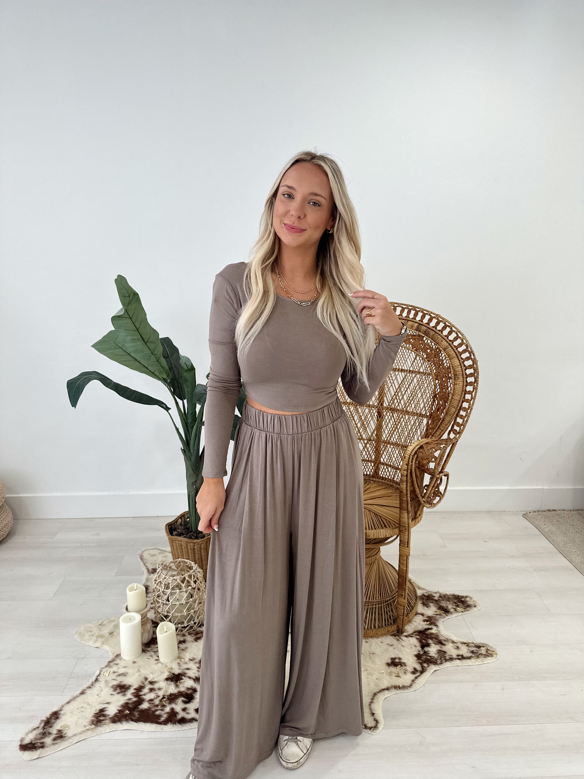 Elevate Your Wardrobe With This Effortlessly Chic Ensemble Featuring A Sleek Long-Sleeve Crop Top And A Flowing Maxi Pants. The Top, Designed With A Subtle Boat Neckline, Enhances Your Silhouette, While The Pants Gathered Waistline Promises Both Comfort And Style. This Set Strikes A Perfect Balance Between Simplicity And Sophistication, Making It Versatile For Various Occasions.
