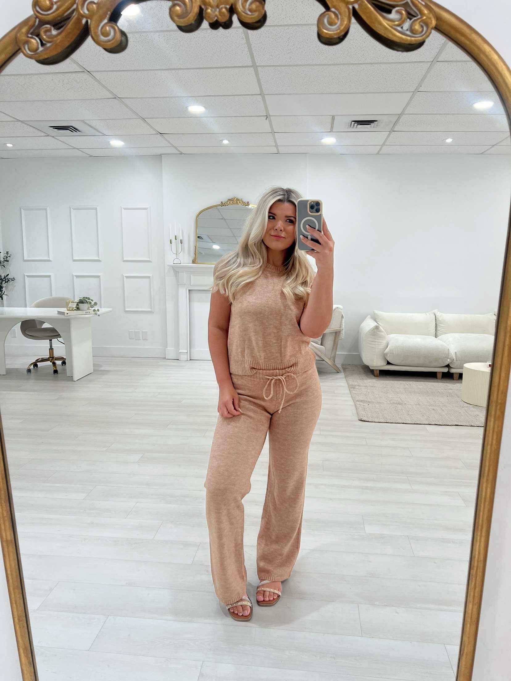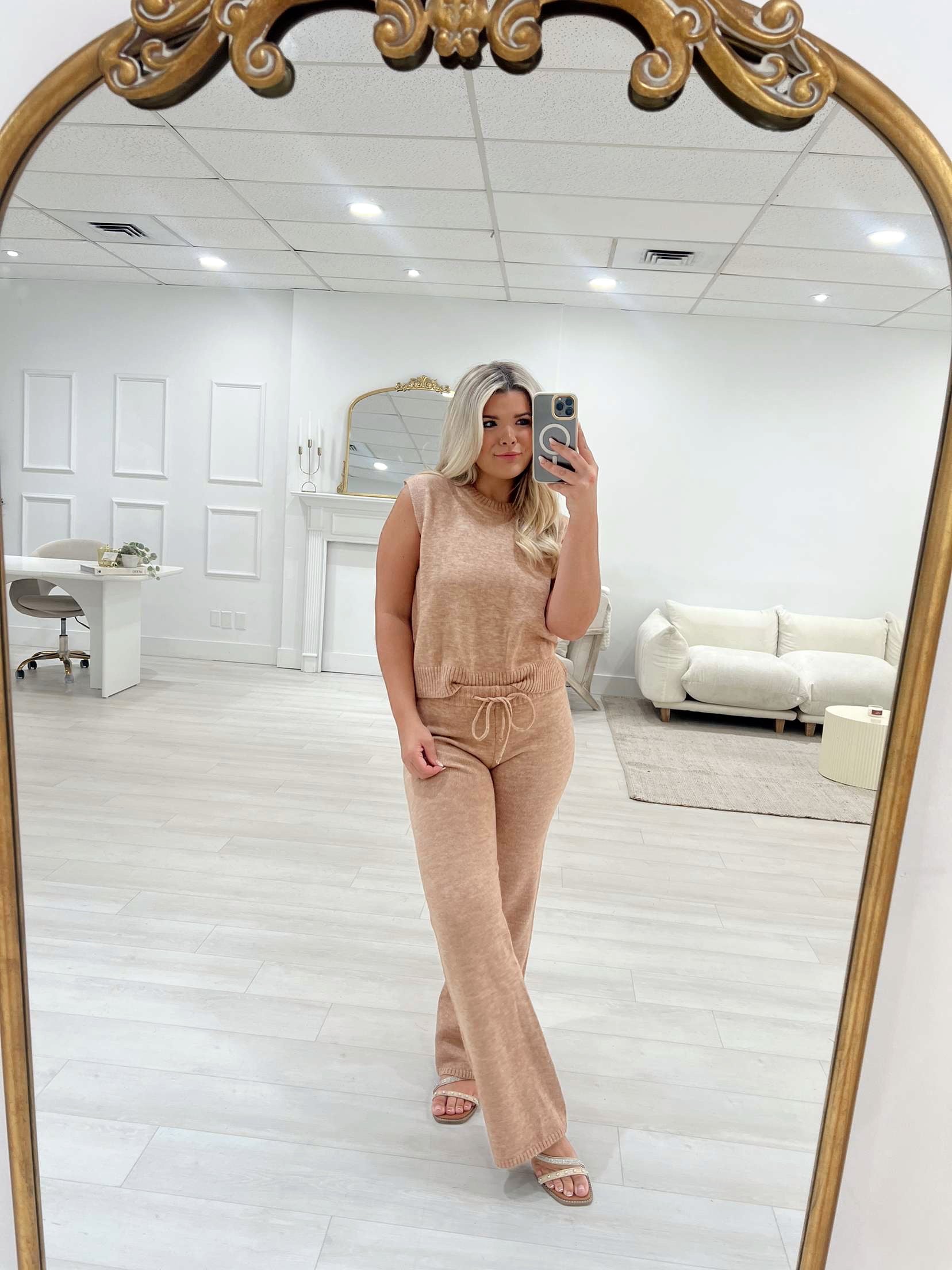 Elastic waist band, adjustable drawstring knit pants with a knit vest top that is sleeveless & hip length